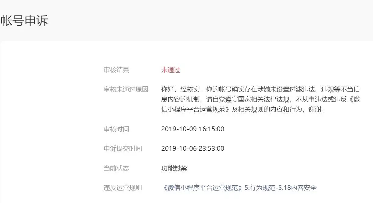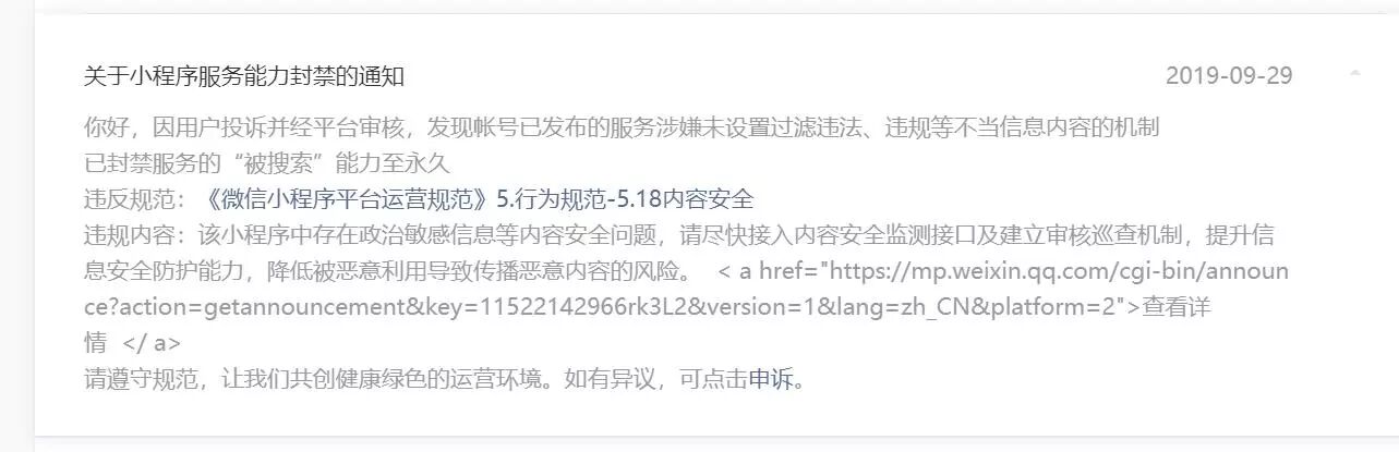 我们小程序真是被冤枉很了,刚好遇到十一管的严格,我干脆直接暂停服务,请问这个如何解除限制?是接入内容过滤api后提交新代码吗?
