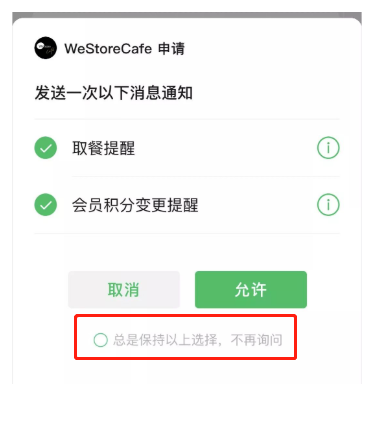 只要勾了了“总是保持以上选中” 下次重新调取来也不弹起来,是正常的 ,但也要给我一个api修改这个状态啊,万一我后悔了呢?不想一直接受消息呢?