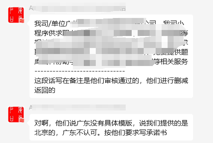 2、没有对应的模板,用其他省份的承诺书上传第一个小程序审核通过,第二个小程序又说广东不认其他省份的,这什么意思?审核没有统一的标准,还是说根据个人喜好?