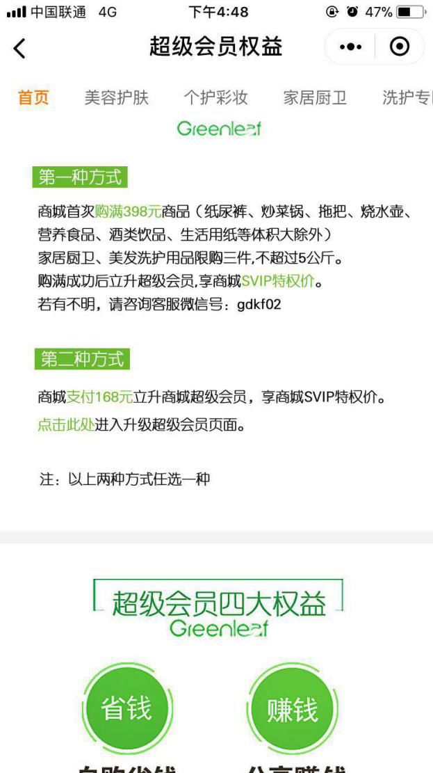 如果客户想成为超级会员,有两种方法,一种是在商城消费满398元,一种是直接支付168元。