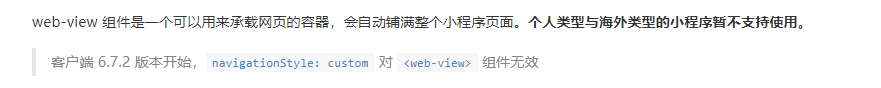 使用小程序自定义导航:navigationStyle: custom 。初衷是为了能够让webview页面的顶部出现一个返回到主页的按钮。就像下面这样:然后结果自己写的导航在webview下失效了。变成了小程序自己的导航。。。。。。 查阅文档发现了这句:我想问一下的就是有没有什么方法可以绕开这个限制。或者有没有大佬提供一下在分享出去的webview页面能够实现回到小程序主页的功能非常感激!!!!