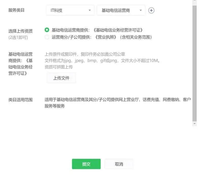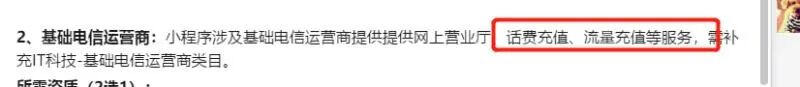 你好,经核实,小程序涉及电信业务代理商提供宽带报装、网上营业厅、话费充值、流量充值等服务,需要补充选择:IT科技-电信业务代理商类目。