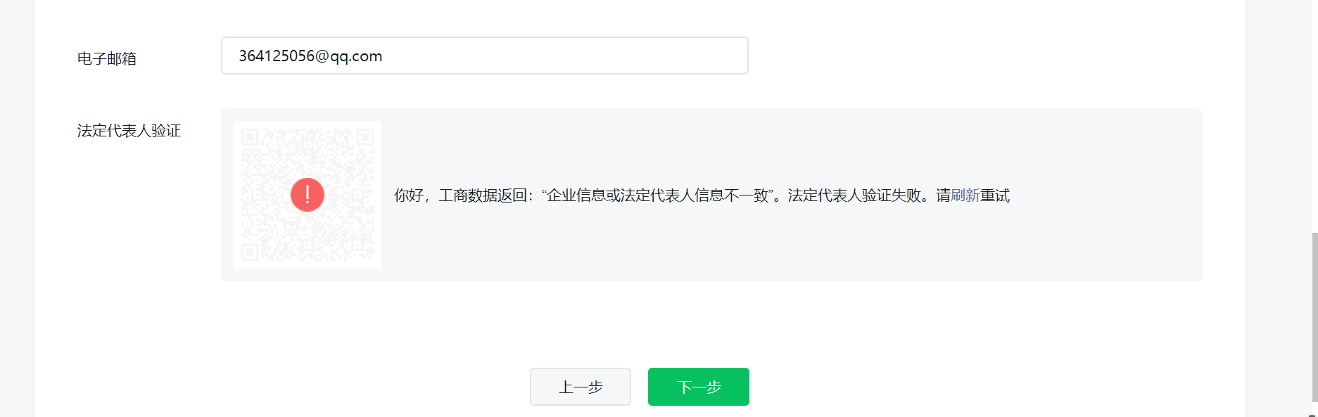 营业执照是我个体的身份证也是我本人,为什么验证扫码老是出现这个?你好,工商数据返回:“企业信息或法定代表人信息不一致”。法定代表人验证失败。 请问该怎么解决?