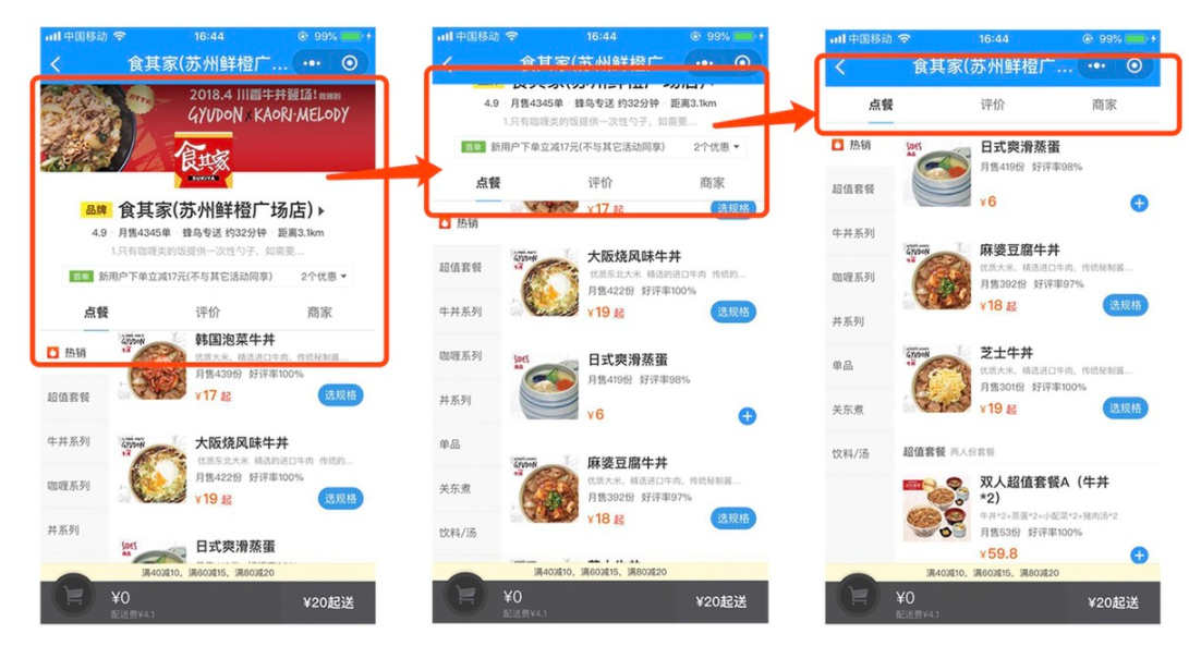 如下图为饿了么小程序点餐页面,上滑的时候顶部隐藏,导航固定在最上面