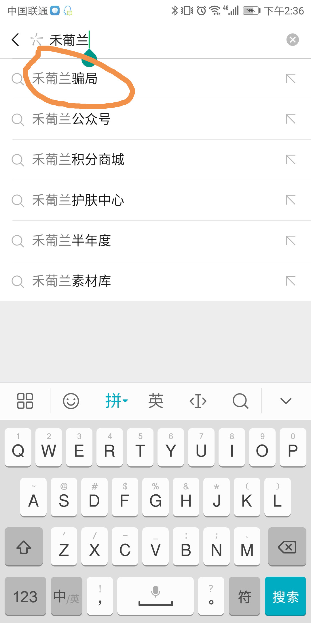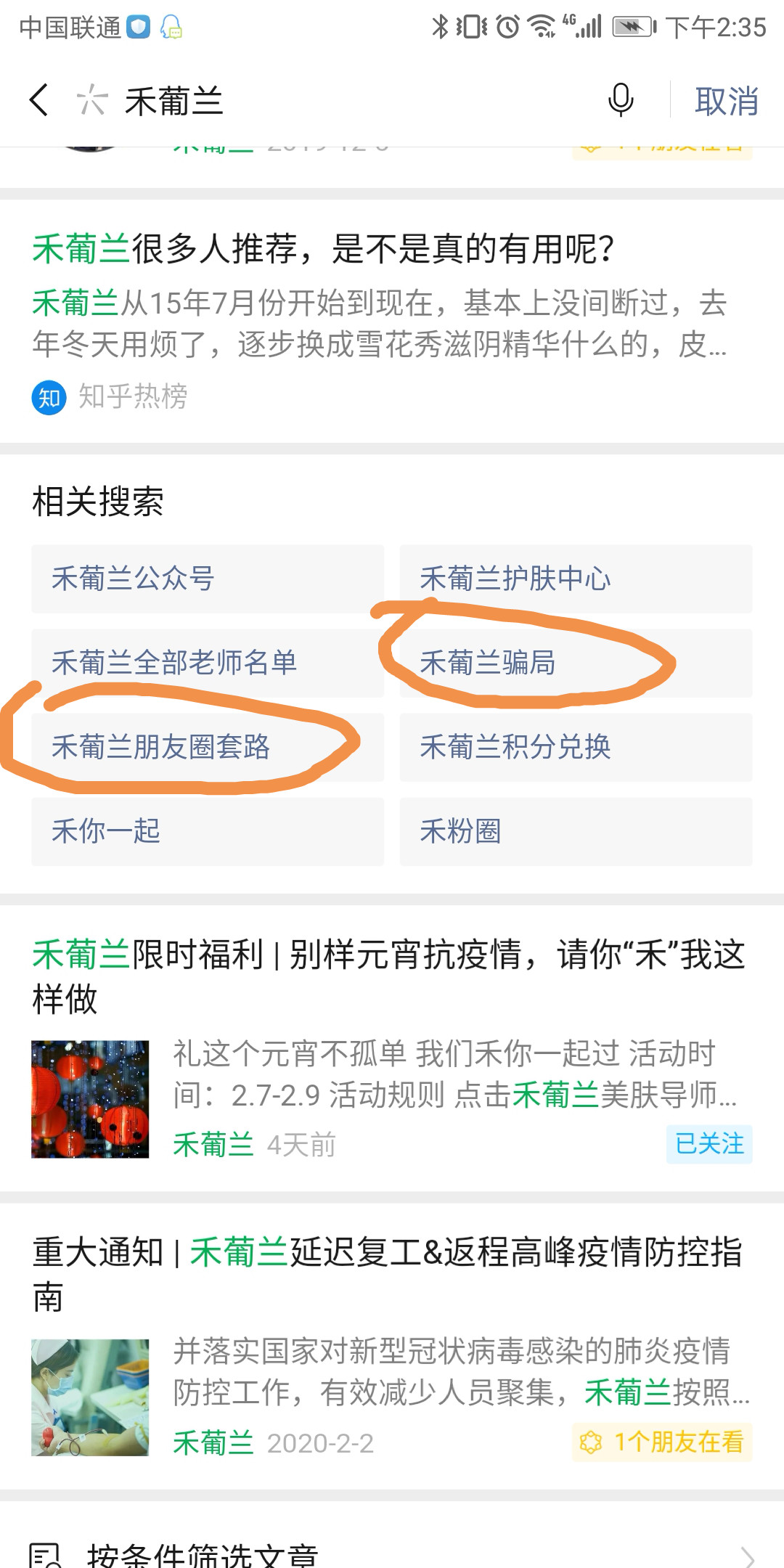 在微信搜一搜输入公司品牌词(禾葡兰)时下拉框以及相关搜索出现诽谤公司的相关词语,如:禾葡兰骗局、禾葡兰朋友圈套路;