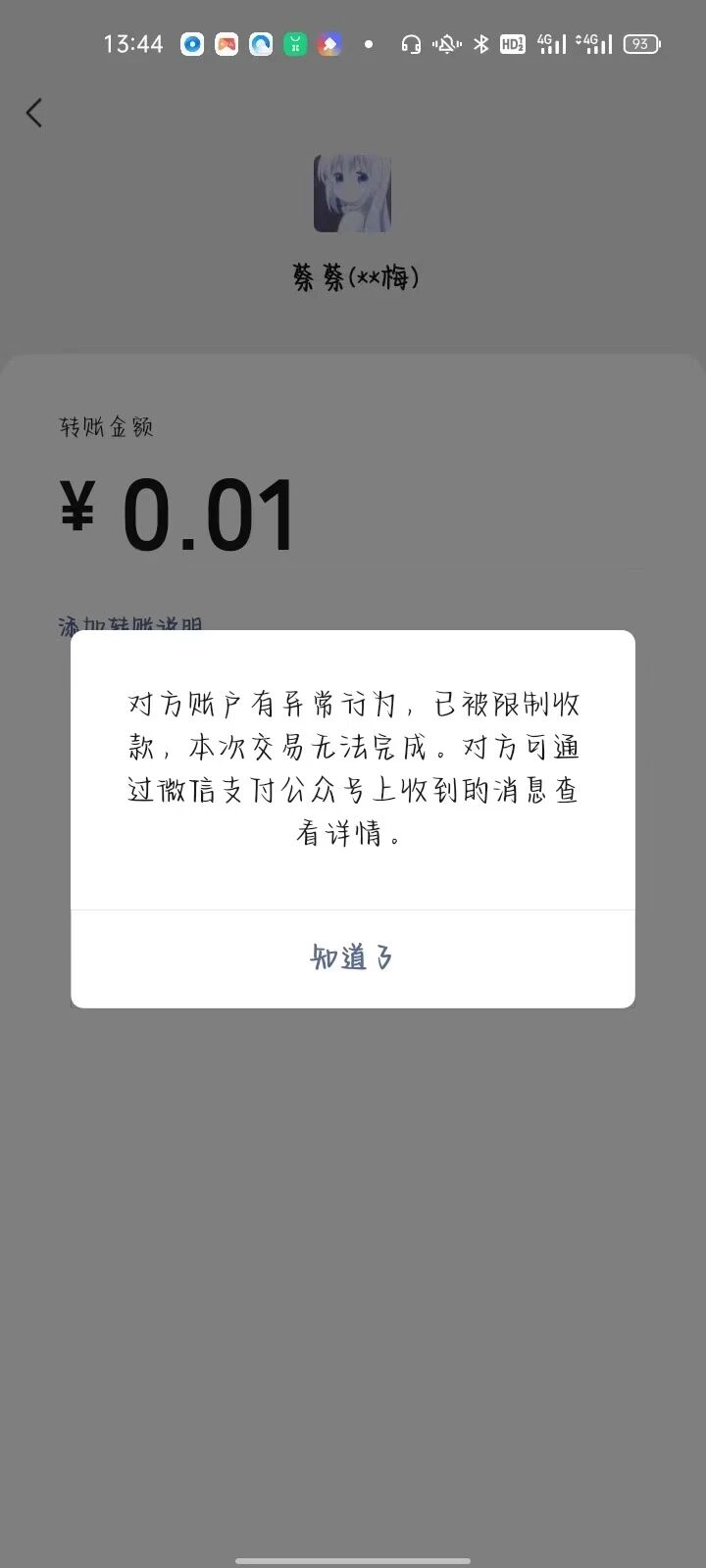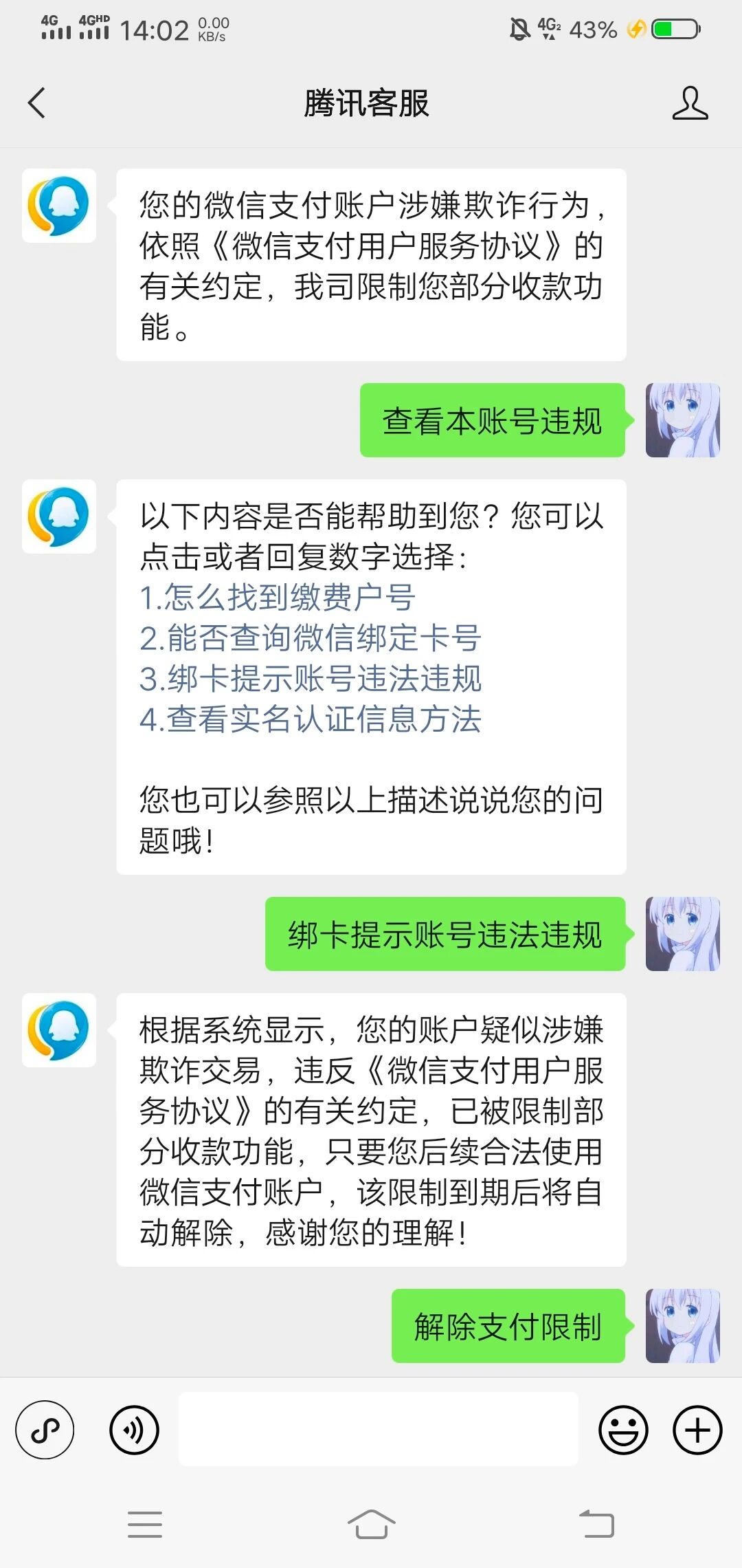 尊敬的客服您好,我是一名高一学生,就是今天我帮我一位同学带东西,然后他扫我微信二维码转账时就突然出现这样的情况,然后我的微信支付公众号给我发了一个微信转账被限制,限制到2022年8月6日,原因是被他人举报诈骗,可客服我都不知道我自己有诈骗别人,如果有那请那个举报我的人去联系我,我什么时候诈骗他了,真的很不理解,我大部分收入都是来自于父母给的钱,还有帮同学买东西的转账,真的很烦,这个月马上就要期末考了,客服大大,我这个月的生活费怎么办啊,转账被限制了,我爸妈都转不了钱给我,希望客服大大看到这个消息,请客服大大能不能帮我解除一下,拜托了,完全不知道发生了什么,莫名其妙的就被限制
