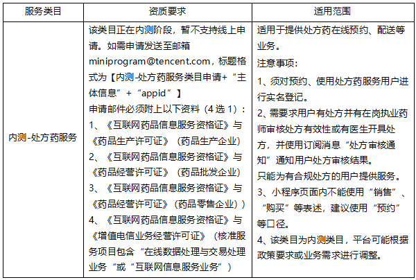 【内测-处方药服务】类目:适用于提供处方药在线预约、配送等功能服务。