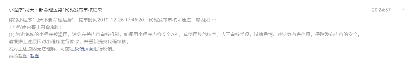 你好,为避免您的小程序被滥用,请你完善内容审核机制,如调用小程序内容安全API,或使用其他技术、人工审核手段,过滤色情、违法等有害信息,保障发布内容的安全(详图如下)