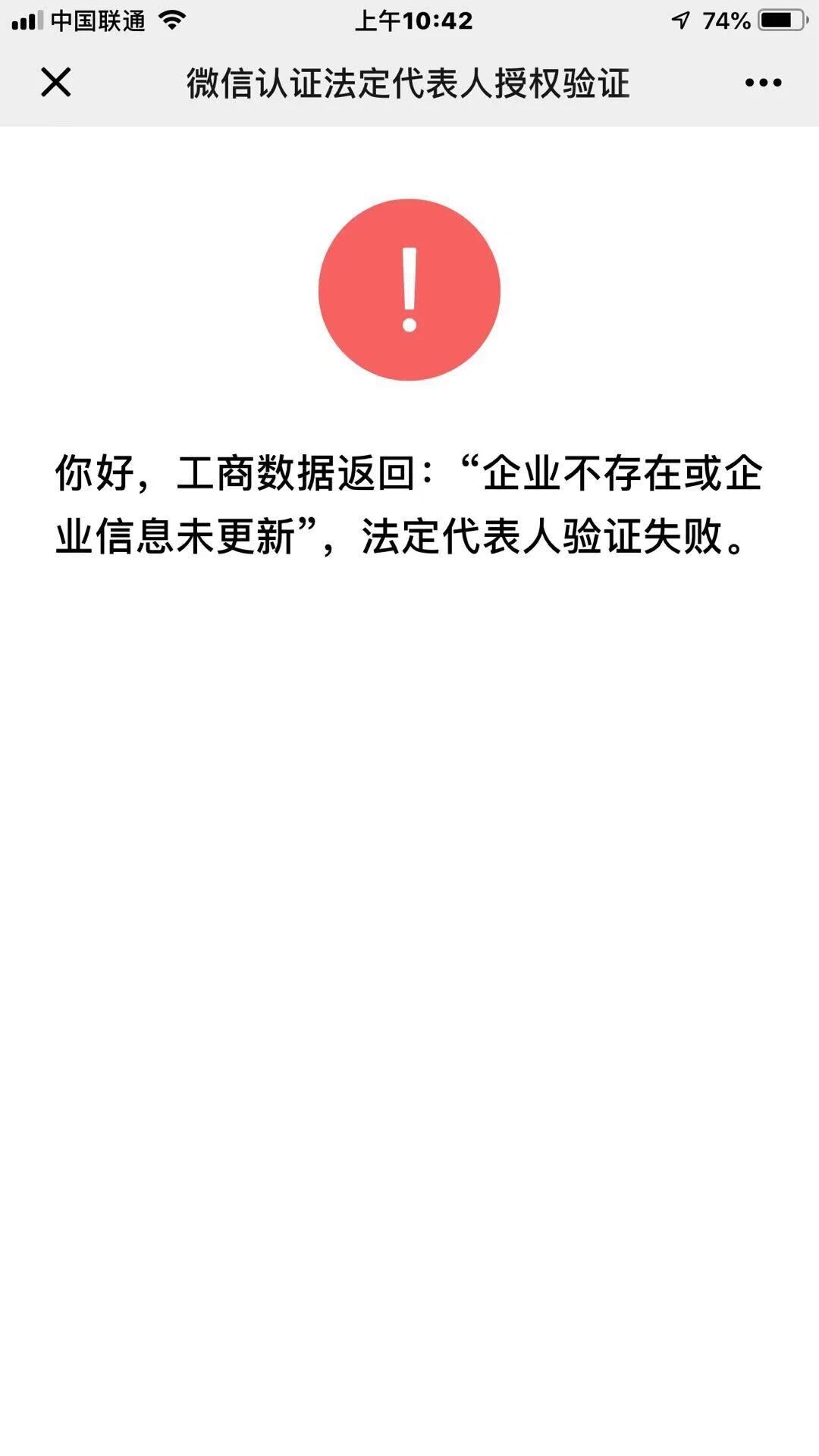 你好,工商数据返回:“企业不存在或企业信息未更新”,法定代表人验证失败。请刷新重试