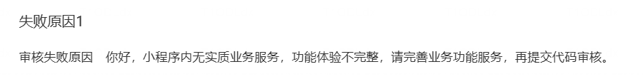 你好,经进一步核实,小程序内涉及无实质业务服务,功能体验不完整,请完善业务功能服务,再提交代码审核。审核将以实际版本内容为准。