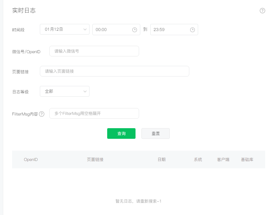 小程序后台——开发管理——运维中心——实时日志,经常不显示内容,只显示“暂无日志,请重新搜索1001”,反复点几次,有时候又会出来内容。