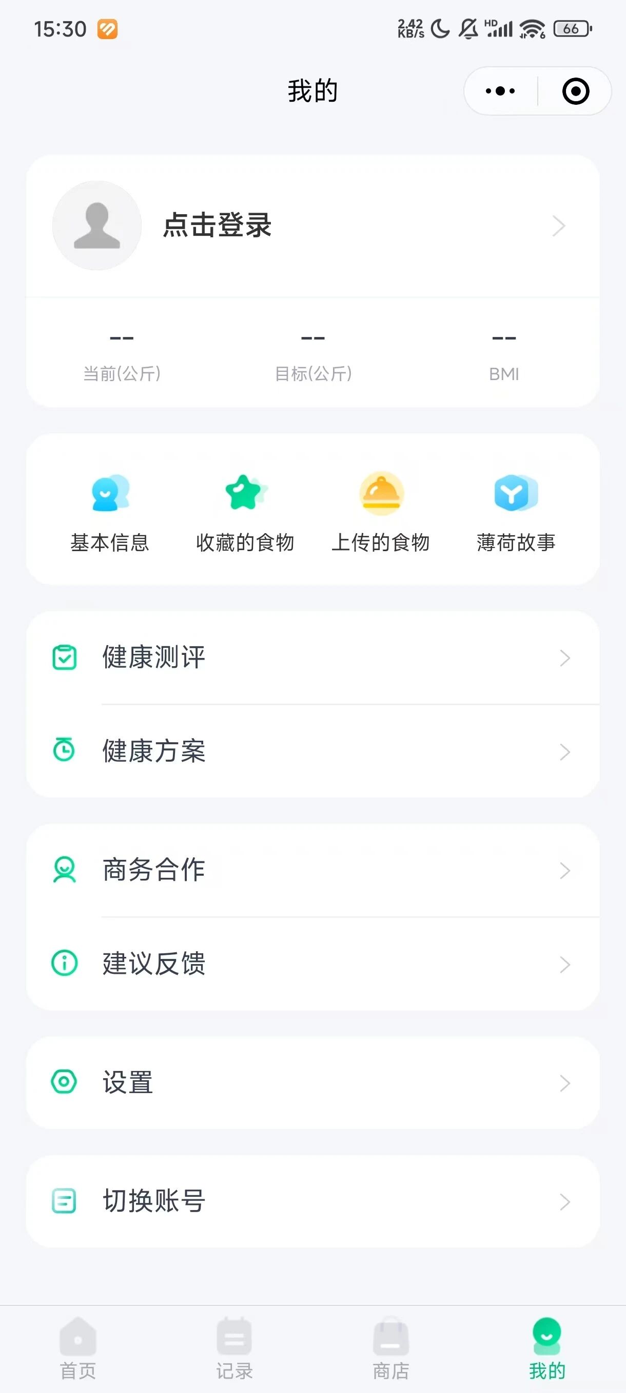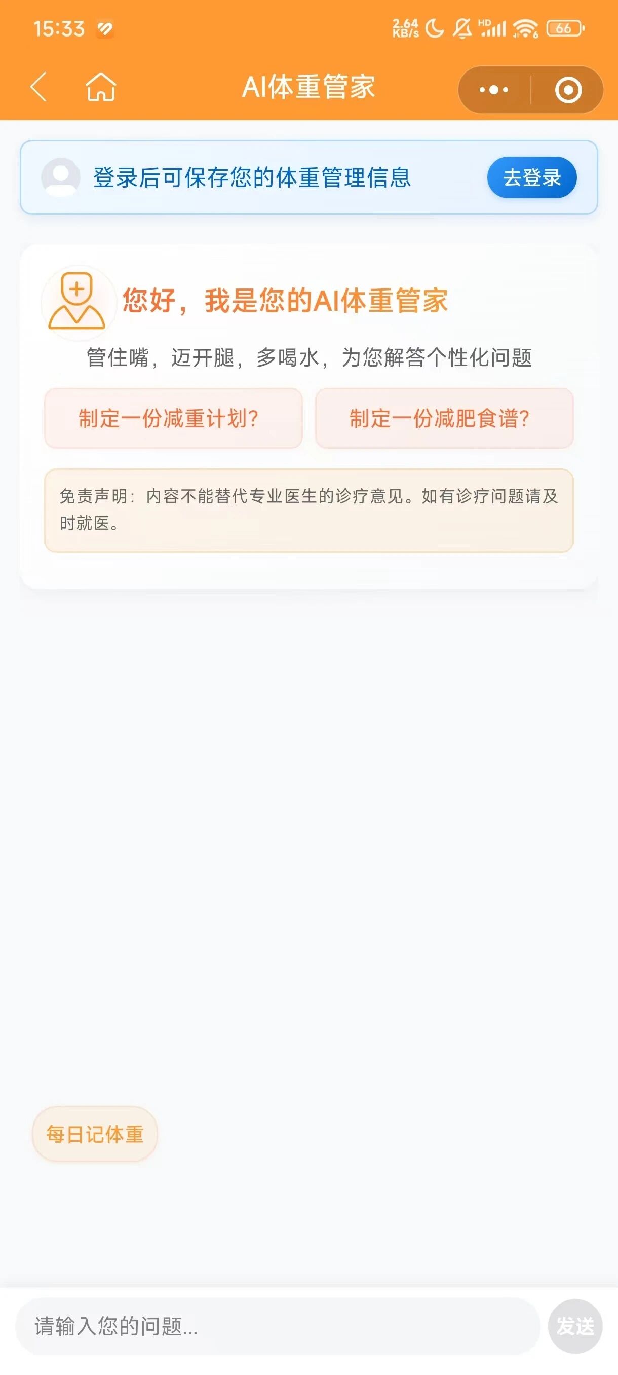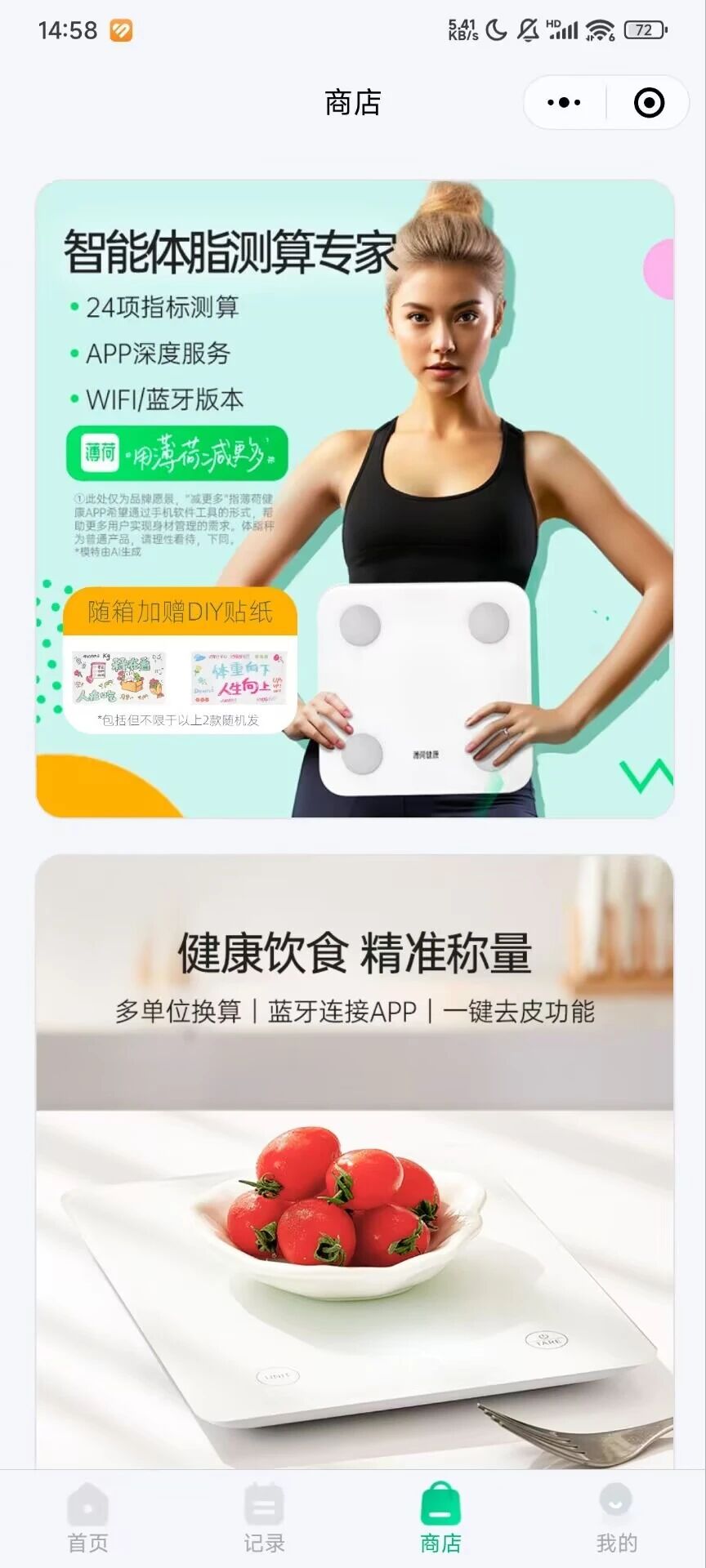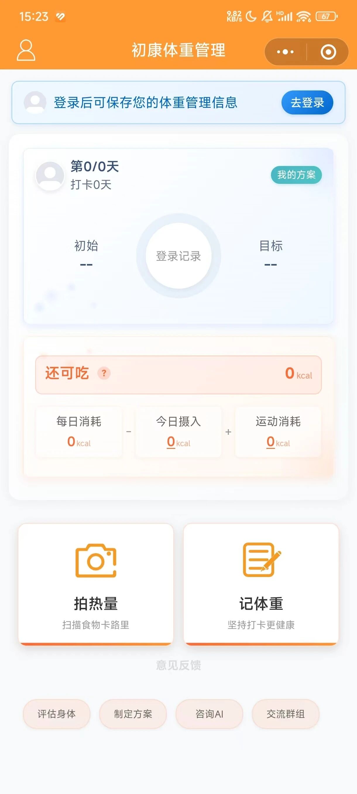 体重管理的小程序,主要功能包括拍照识别食物热量,AI对话制定减肥计划在线问诊,每日健康打卡并记录排行榜,商城产品包括食品、体重秤以及健康方案咨询等,健康问卷测评,健康报告打分,组别步数及消耗热量排行榜,用户分组群聊,用户示例上传,意见反馈,商务合作联系以及设备接入。如下所示的参考图
