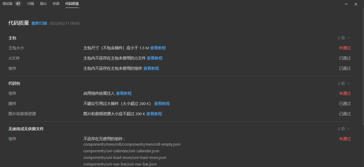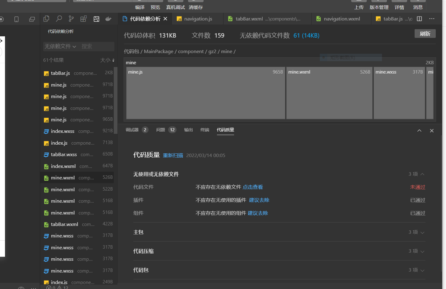 【必须】在「代码质量」面板,点击「建议去除」后,可以打开代码依赖分析面板的「无依赖文件」页面,这里可以看到代码包里没有被用到的文件。请在代码包中去除这部分文件,减小体积并优化加载速度。
