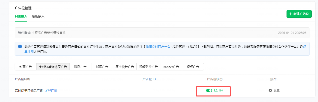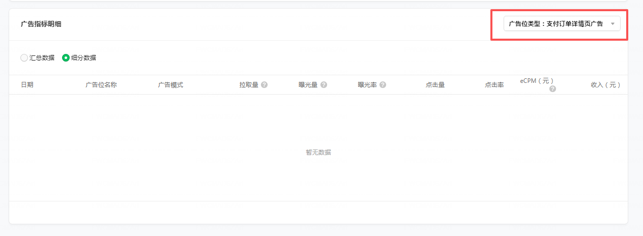 已开启一段时间【支付订单详情页广告】(图1),但是在数据统始终没有看到该选项的收入(图2),为什么?是我漏了设置什么吗?