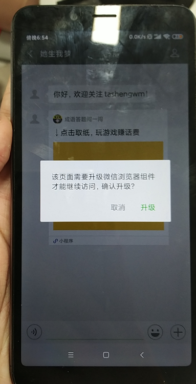 微信版本:6.7.3,公众号客服消息发送小程序卡片,点击打开提示该页面需要升级微信浏览器组件才能访问。通过小程序搜索直接打开小程序可以打开。