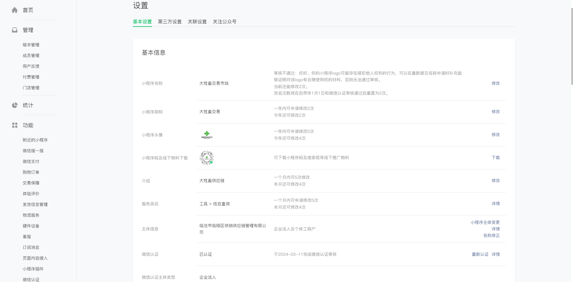 小程序不能有线上购物发货的流程,否则比如严格按照监管来接入,应该算是一种担保交易。然后申请关闭订单发货管理,写一堆申请材料图文并茂说明小程序只是线下业务用,申请只有一次机会,通过之后,就可以自由关联其他银行的渠道了。如下图: