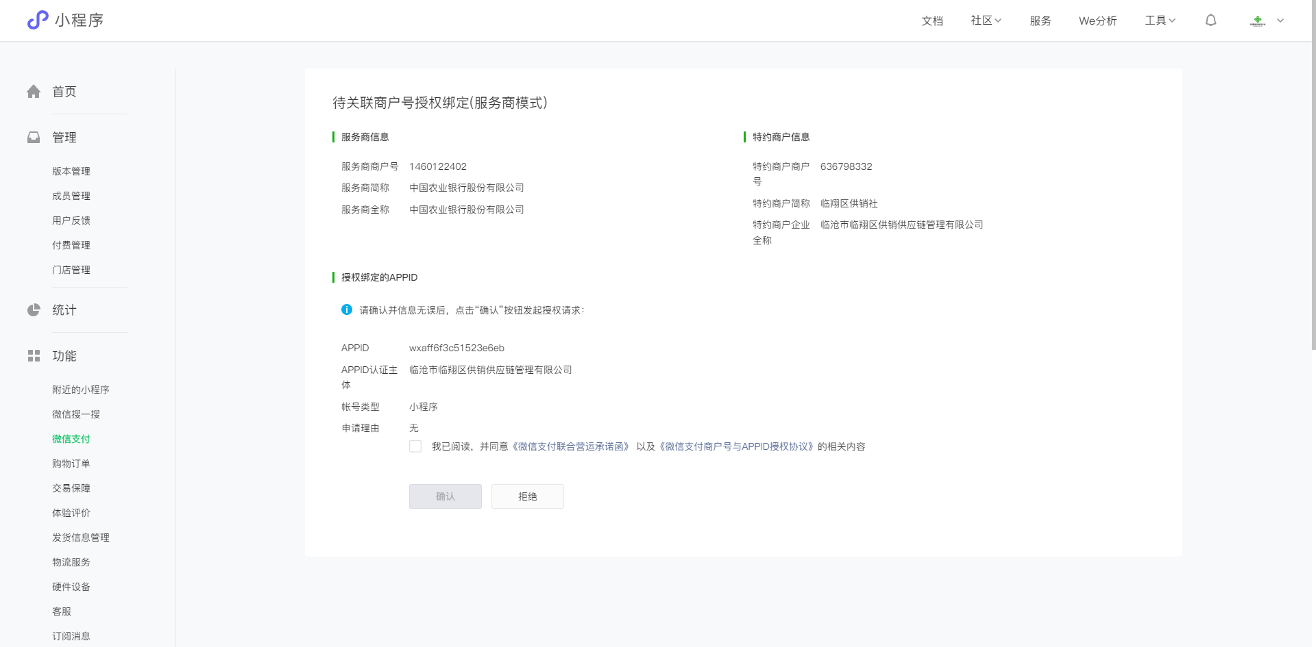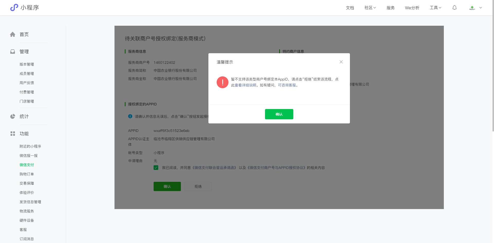 当前小程序需要接入农行通道的微信支付功能,用于买卖双方在市场内交易进行收款。但在绑定appid时,提示暂不支持该类型商户号绑定本AppID,请问这个该怎么解决?
