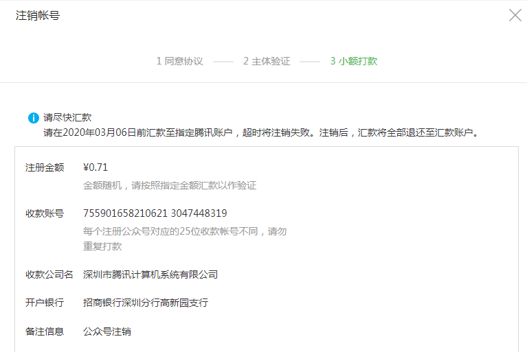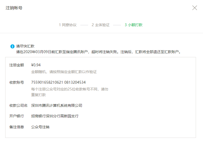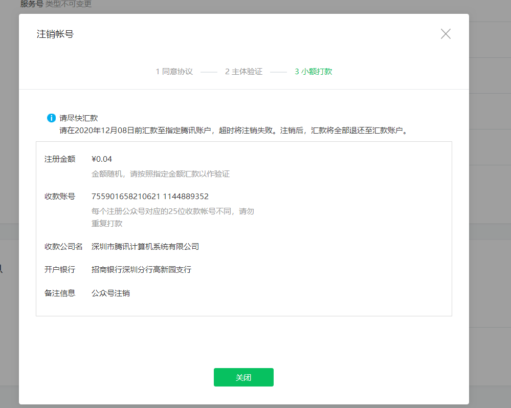 已经提交了注销公众号的申请,对公打款也已经打过去了,但是公众号里边还是停留在提示打款验证的界面,这个是咋回事
