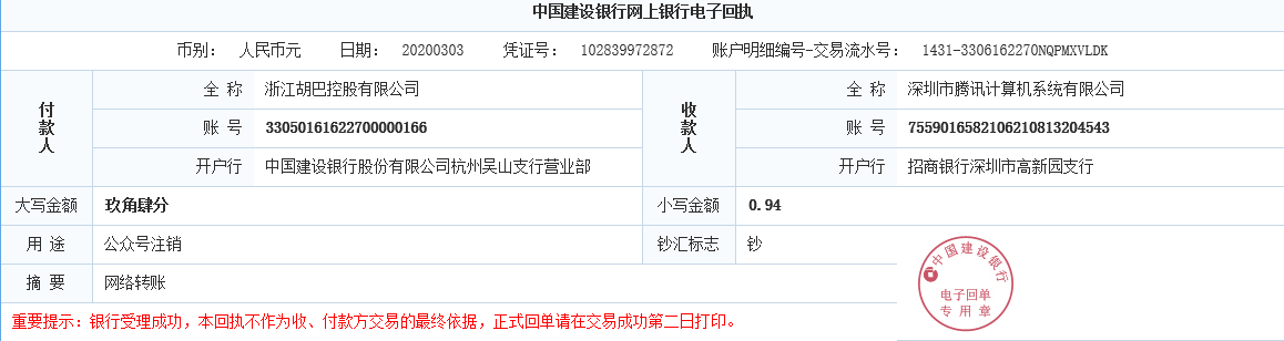 请平台帮忙解决问题,我司公众号胡巴控股ID(hubakonggu)申请注销,对公账号已于3月3日安排打款,但系统还是一直停留在待打款页面,无法完成注销。详细情况见附件图片,希望平台审核并尽快解决。