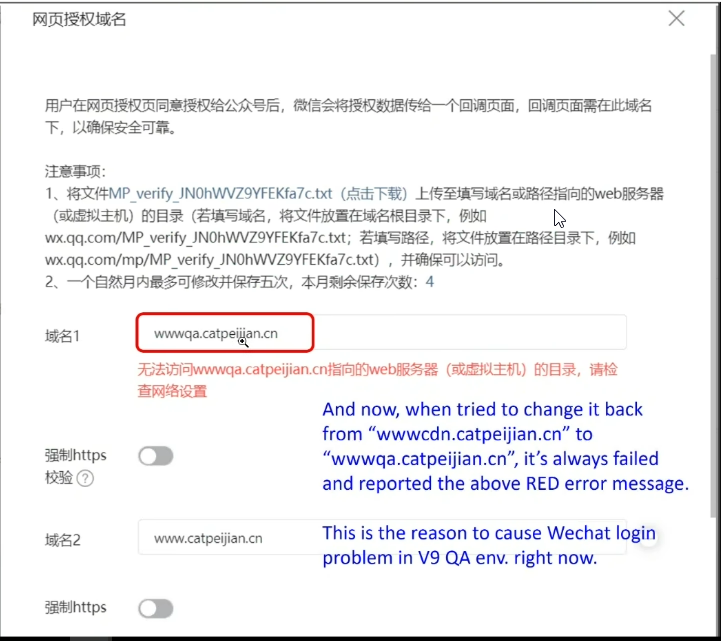 我是卡特配件商城的项目经理,现在我们系统平台升级后的测试环境有些改动,之前商城可以通过微信扫描授权后登陆,现在根据网页授权域名注意事项操作后,出现红色字体报错。请尽快帮忙解决此问题,请打拨打电话18651347801联系,感谢支持,谢谢。