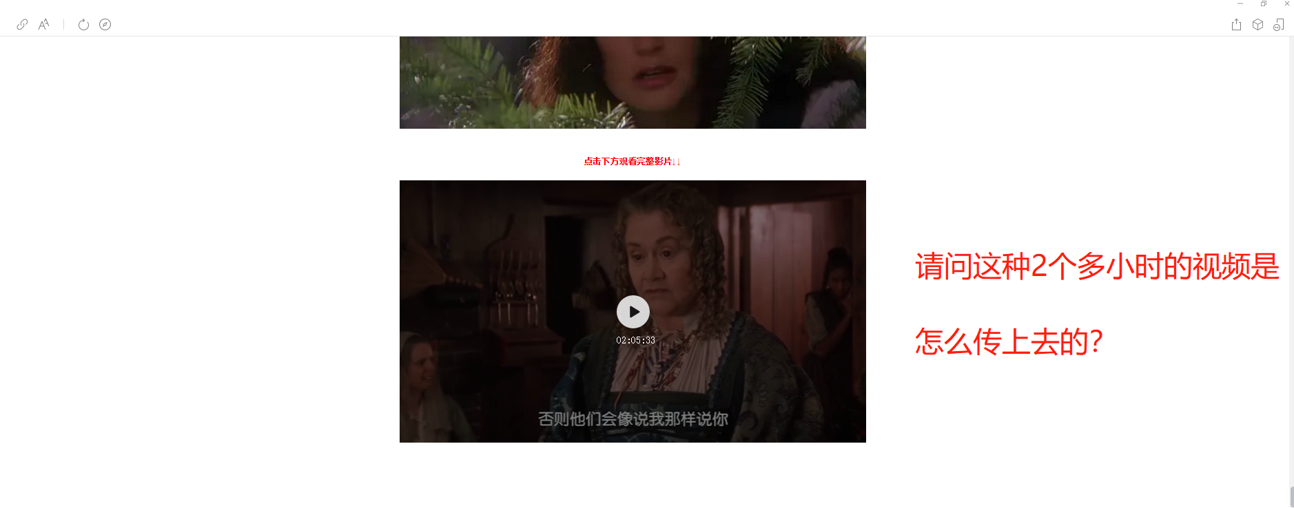 如图,公众号图文里插入的视频,是如何插入时长超过2个小时的视频呢?也不是通过腾讯视频上传的,因为电影里有水印,肯定通不过审核的。也不是通过小程序,因为通过小程序嵌入不是这样子的。那么,这种2个多小时的视频是怎么上传并正常发布的呢?该公众号原文章链接:https://mp.weixin.qq.com/s/aSBlJGj9tPjgkeEB_Nd9dg