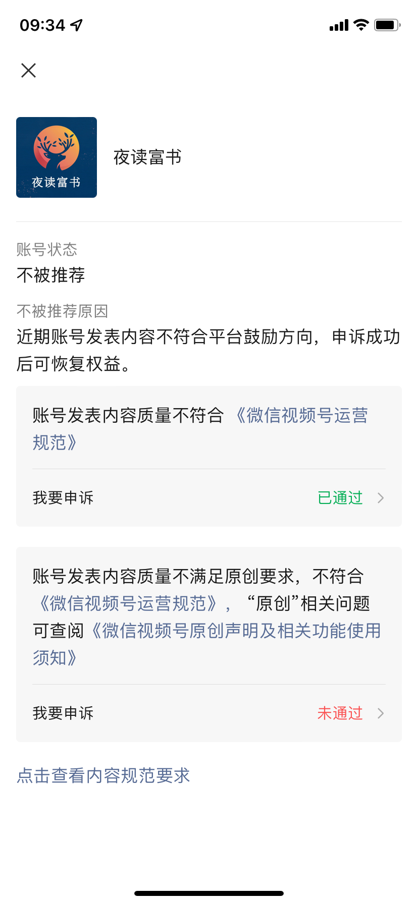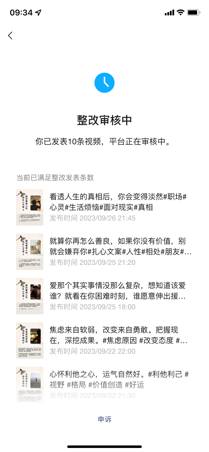 你好,我的账号收到平台的消息,说违规,然后我按照规定发布了10条以上的原创作品,现在一直在审核期,本来这没什么吗?但是这个审核期也不说多久,从意见反馈处咨询又没人搭理,只有下面的申诉按钮,然后我就等不及点击申诉,但是2个申诉一个给过了,另一个显示没过(这个没过是因为刚开始不懂规则我就点击了申诉,但现在我发布作品后这个部分并没有新的申诉入口)就不知道怎么弄。我发布的最新10条内容,每个从文案到配音、剪辑都是自己原创的,做一个视频近1小时时间,希望能给个回复,是继续等待还是平台能给个申诉入口?