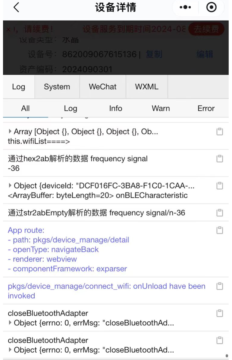 安卓端、iOS端 多次写入数据wx.writeBLECharacteristicValue 偶现wx.onBLECharacteristicValueChange无回调 有时候收到第一条数据后后面无回调 有时候是接收到了硬件方发送的一半数据 硬件方始终是20字节 我这边也没有超过20字节 这里的wifiListStr我会在设备端发送给我sendWifiListOK之后重新解析一遍 当前这个代码是当做一个mixins使用的 frequency signal 是硬件发送的自定义数据(第一条数据),后面就没执行了也没报错 返回上个页面关闭了蓝牙适配器