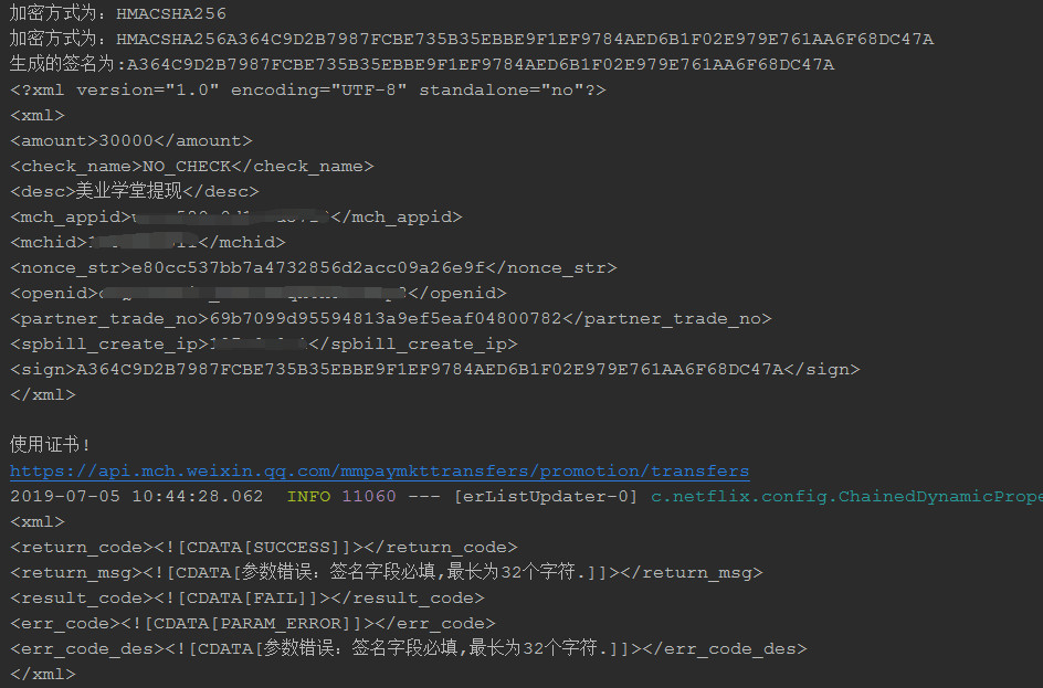 调用企业付款API 参数一个一个核对,生成的签名跟签名工具比较 都一模一样,但是每次提醒报错,参数错误:签名字段必填,最长为32个字符??????????