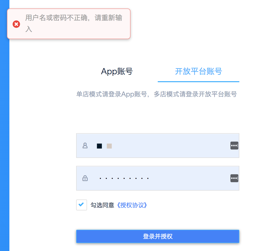 1.达达:一直提示账号或密码错误。然后我旁边就登录着他们的开放平台,用的相同账号和密码。查了其它帖子,说把用户名换成商户ID,也报错。
