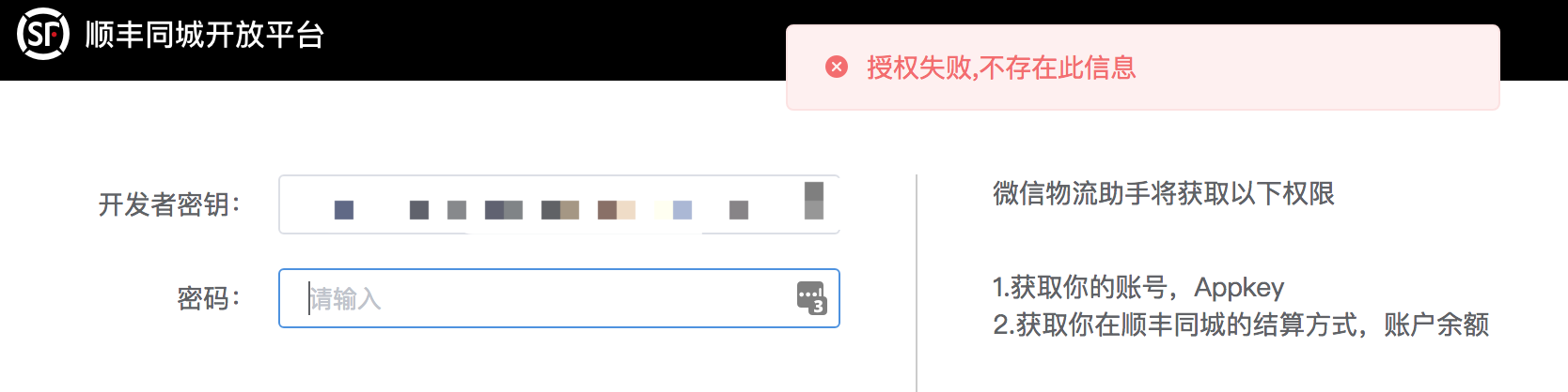 3.顺丰同城:输入了测试环境下的开发者密钥和登录开放平台的密码,一直提示我“授权失败,不存在此信息”。
