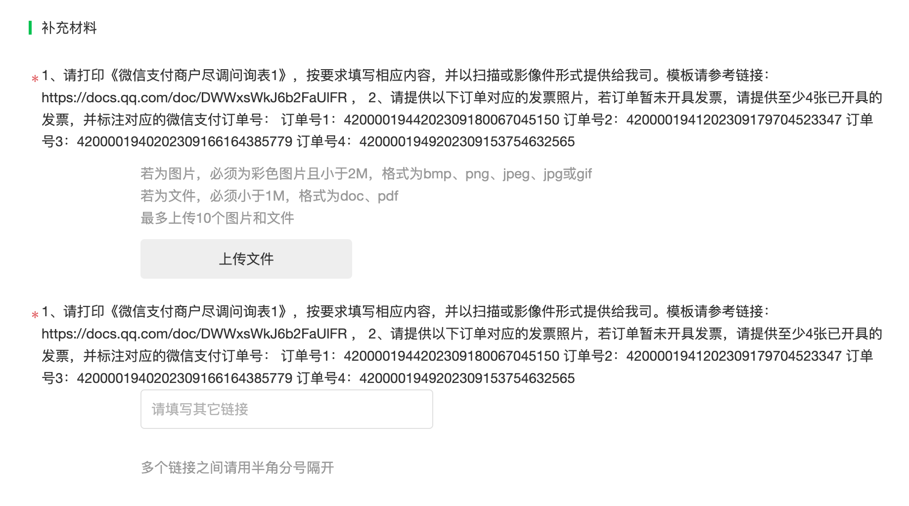 补充特殊材料入口进去后,需要填写《微信支付商户尽调问询表1》及4张发票
