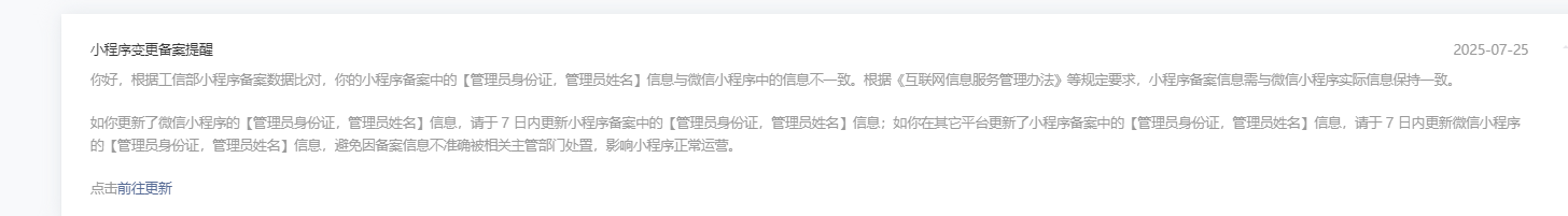 我也遇到了同样的问题,因为之前的小程序管理员离职了,就将小程序管理员修改成了我,但是现在小程序通知提示备案管理员和小程序管理员不是同一个人,需要变更备案管理员信息,修改备案管理员信息,居然需要重新上传所有的备案信息,真离谱呀,不能单独提供一个入口修改备案管理员信息