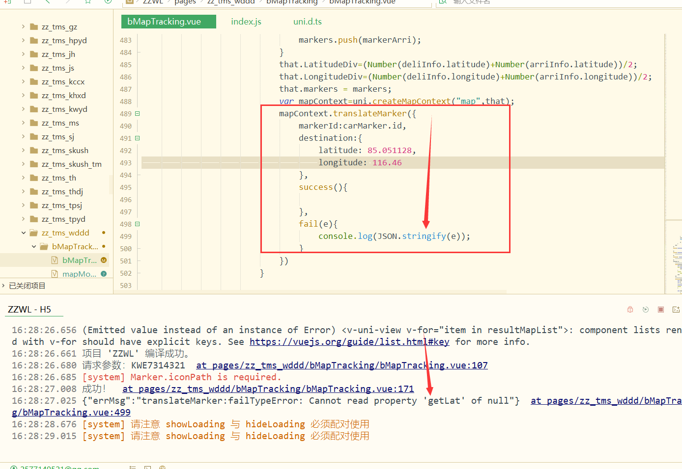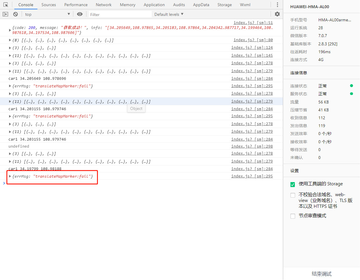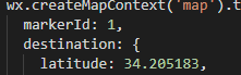 wx.createMapContext('map').translateMarker({ markerId: "1", destination: { latitude: 34.205183, longitude: 108.97864 }, autoRotate: false, rotate: "0", duration: 9000, fail: function(err) { console.log(err) }, success: function(suc) { console.log(suc) } }) |