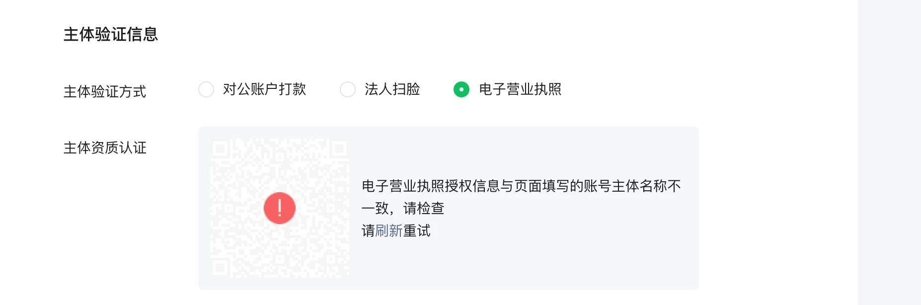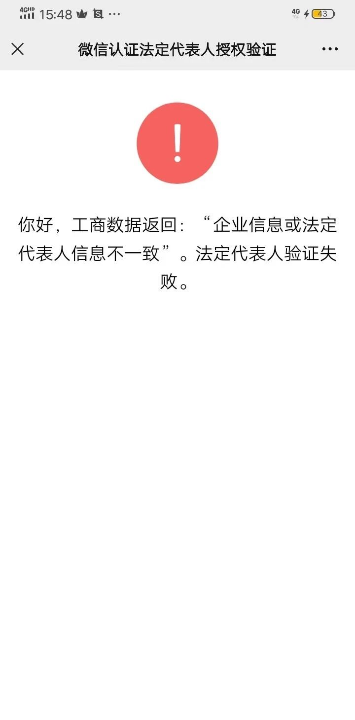 小程序原始ID:gh_28876d9a446d 小程序注册做微信认证 无论是法人扫脸还是电子营业执照 均显示不一致如下图所示