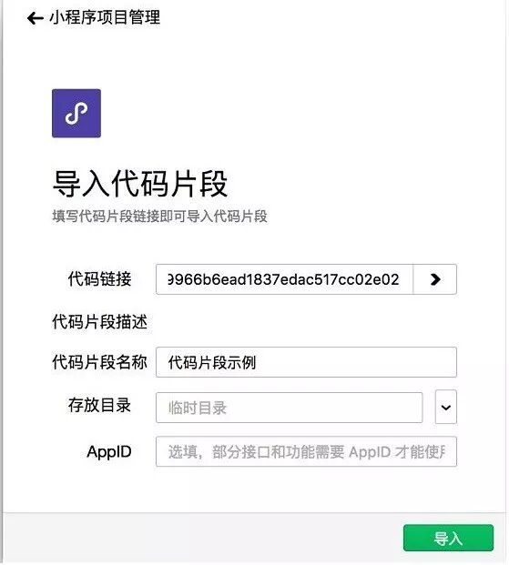 在导入的页面中输入链接就可以展示代码片段的名称和描述,在导入之前开发者还可以修改名称、选择存放的目录以及填入 AppID。