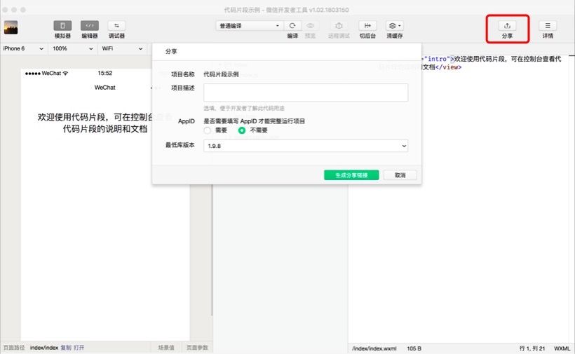 在发表小程序开发经验的文章中带上代码片段的分享链接,可以更好的让其他开发者理解你想表达的意思;