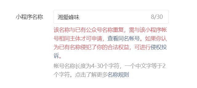 同主体公众号名称已经设定,同主体的小程序名称无法设定为同名称。显示(该名称与已有公众号名称重复.....)但是核实确定的确是同一个主体!是不是主体公司名称的大小写()括号导致的!这个无法设定同名称,请问管理员可以核对放行吗?