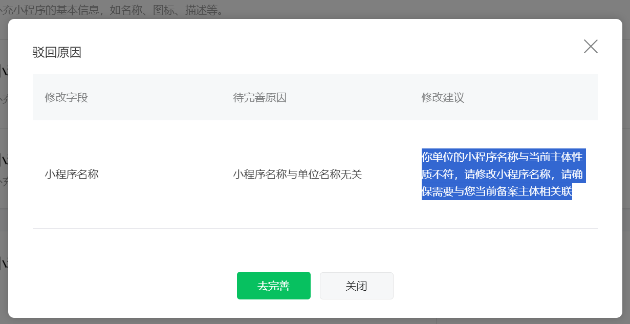 你单位的小程序名称与当前主体性质不符,请修改小程序名称,请确保需要与您当前备案主体相关联