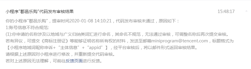 小程序“鄠邑乐购”于2018-07-13完成微信认证审核,一直正常使用更新,2019年12月8日鄠邑乐购小程序迁移主体,选择不变动小程序名称,使用原名称“鄠邑乐购”并于2019年12月10日迁移审核成功,至今更新小程序代码多次,都审核成功,最近一次于2020年1月2日更新小程序代码,也是处于审核成功状态,2020年1月8日提交审核未通过,官方提示账号信息不符合规范,一直正常审核使用 怎么现在突然说账号信息不符合规范,为何不提前告知?正常使用这么久了,现在说账号信息不符合规范,望官方给一个合理的说法,感谢。