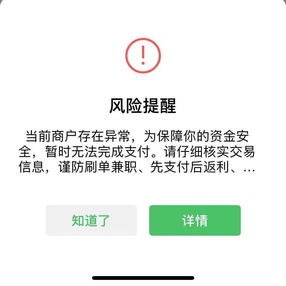 微信小程序支付,支付异常显示文案提示:当前商户存在异常行为,本次交易暂无法完成