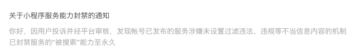 被封禁,已经全部处理相关内容,并再内容发布时增加安全过滤,特此请求解封本小程序的“搜索小程序”能力。