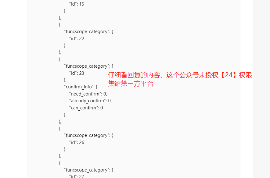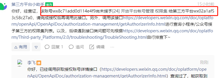 你好,经查证,该账号wx8c71add0d114e4f9尚未授予[24] 开放平台帐号管理 权限集 给第三方平台wx02a1af53c58c27a0,请完成授权后再调用此接口。另外,调用该接口https://developers.weixin.qq.com/doc/oplatform/openApi/OpenApiDoc/authorization-management/getAuthorizerInfo.html进行查询小程序/公众号授予第三方的权限集列表。以及,后续遇到接口类问题可先根据https://developers.weixin.qq.com/doc/oplatform/Third-party_Platforms/2.0/troubleshooting/TroubleShooting.html自行排查下~