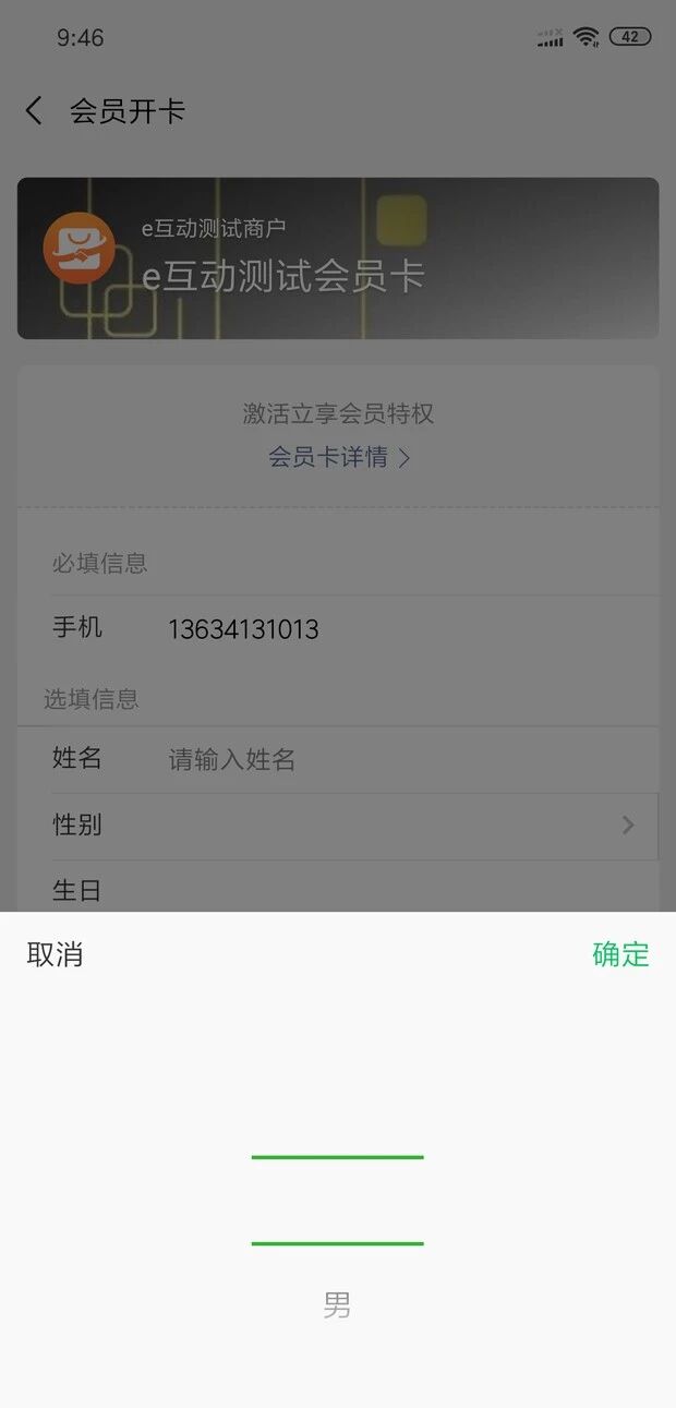 appid wxf4297247c50e4a24 进入南讯E互动 小程序 我的页面 点击头像旁的小会员卡图标 调起开卡组件 进入后点击性别 会有上图1的展示 0是多余的 滑动一下之后0就消失了 如图二