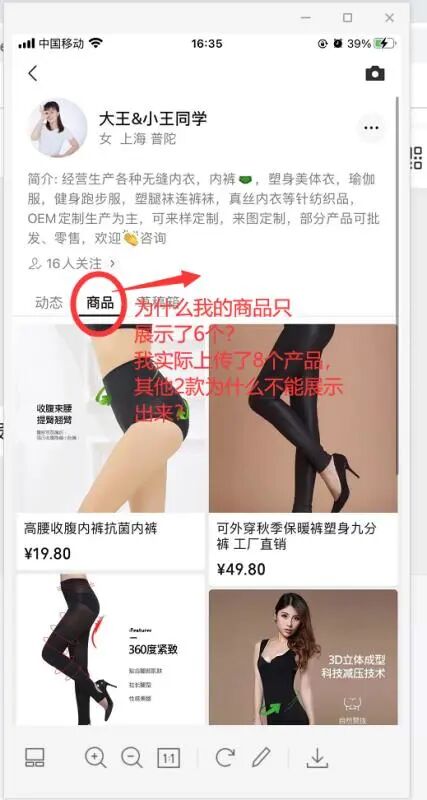 我的微信小店里有9款产品, 后台产品列表也显示有9款在售, 但是, 从视频号旁边的【商品】点击进入后, 只能看到6款产品, 这是为什么啊? 问题如下图所示: