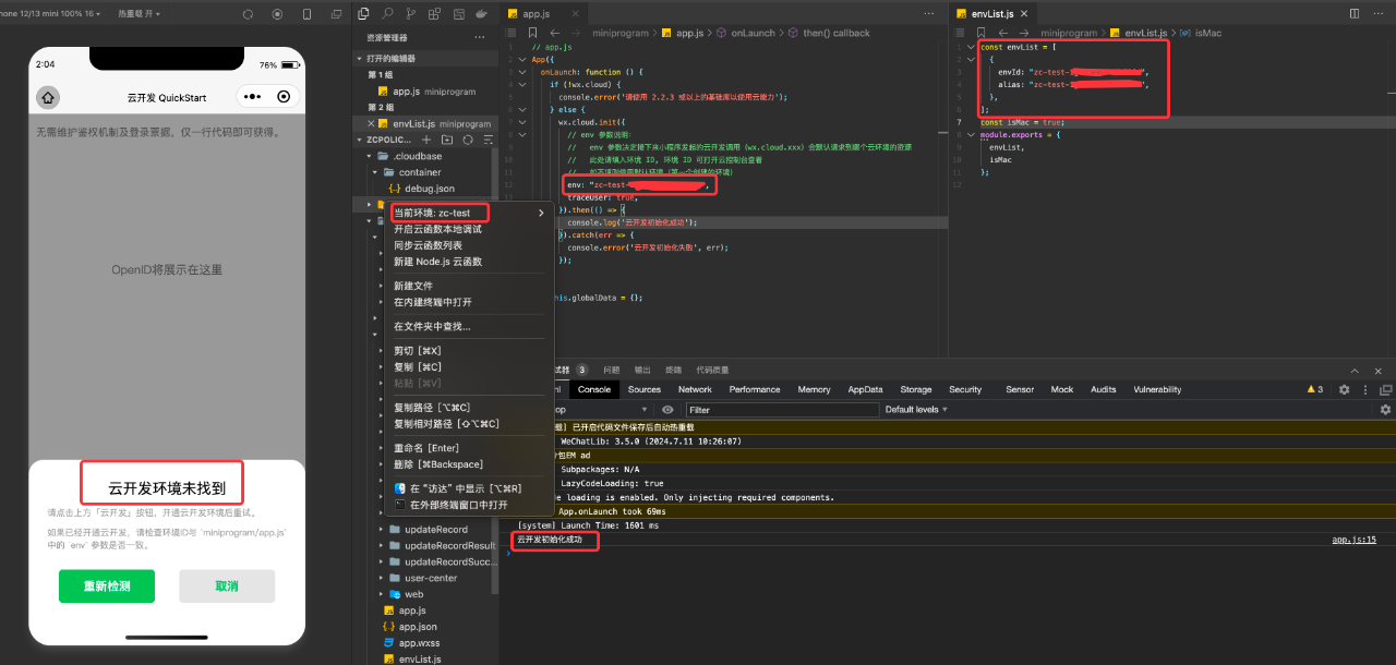 新建的云开发小程序项目,按教程创建了云环境,并填写了云环境ID参数,但调试过程中一直提示云开发环境未找到;看了下初始化函数的promise回调也是提示初始化成功的,但就是一直提示环境未找到……具体是什么原因呢?