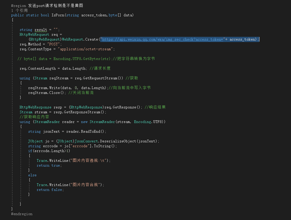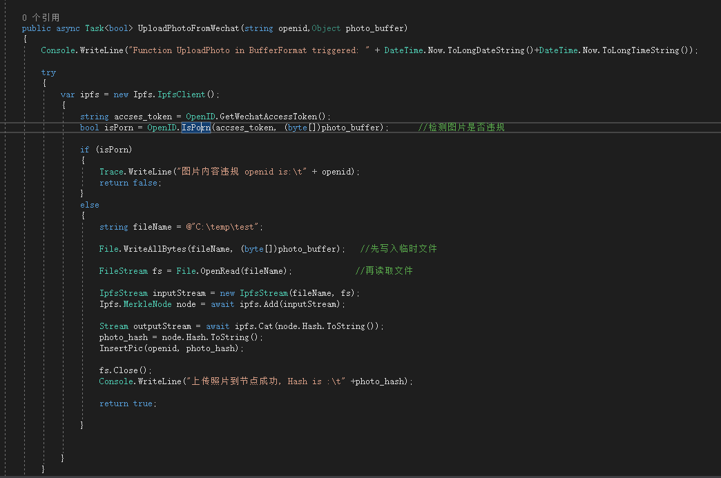 星际相册已经增加了图片违规检测功能,采用的腾讯官方的API检测,请求予以恢复被搜索的功能。下面是检测的后台代码截图。