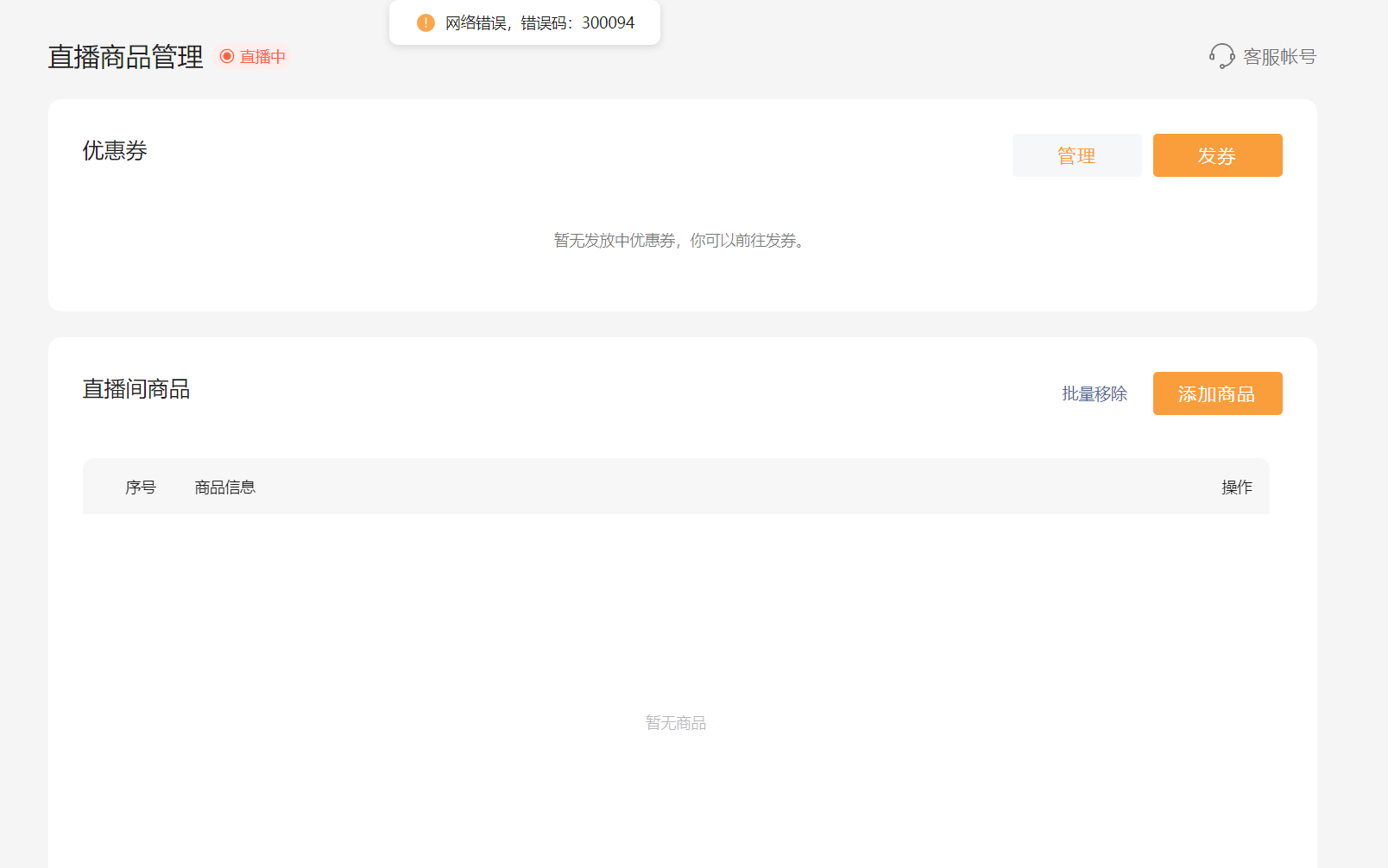 直播间无法添加商品,提示错误码300094