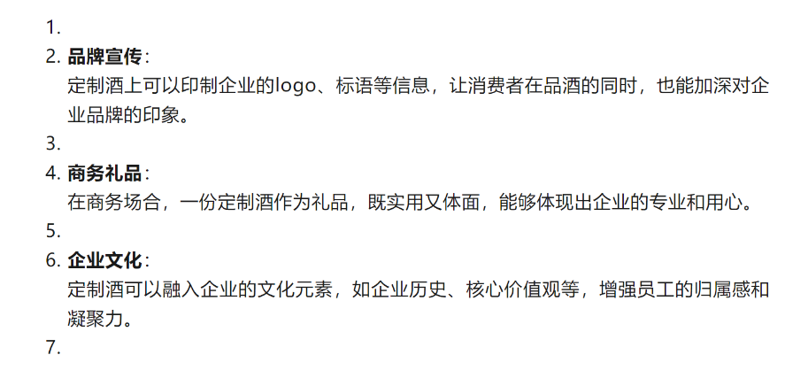 <li><strong>品牌宣传</strong>:定制酒上可以印制企业的logo、标语等信息,让消费者在品酒的同时,也能加深对企业品牌的印象。</li>