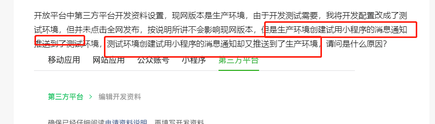 开放平台中第三方平台开发资料设置,现网版本是生产环境,由于开发测试需要,我将开发配置改成了测试环境,但并未点击全网发布,按说明所讲不会影响现网版本,但是生产环境创建试用小程序的消息通知推送到了测试环境,测试环境创建试用小程序的消息通知却又推送到了生产环境,请问是什么原因?