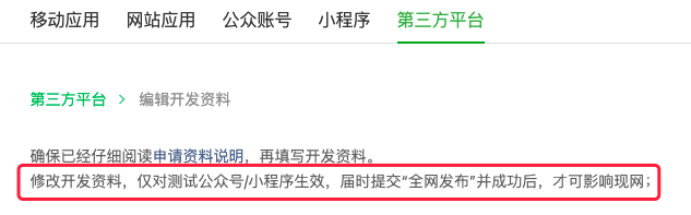 "修改开发资料,仅对测试公众号/小程序生效,届时提交“全网发布”并成功后,才可影响现网;"